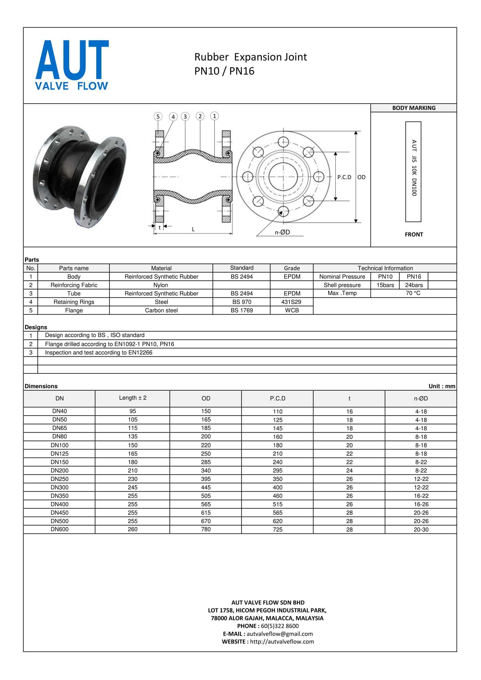 Khớp nối cao su AUT được làm từ cao su EPDM có hai đầu nối ren hoặc nối bích bằng thép mạ kẽm hoặc Inox.